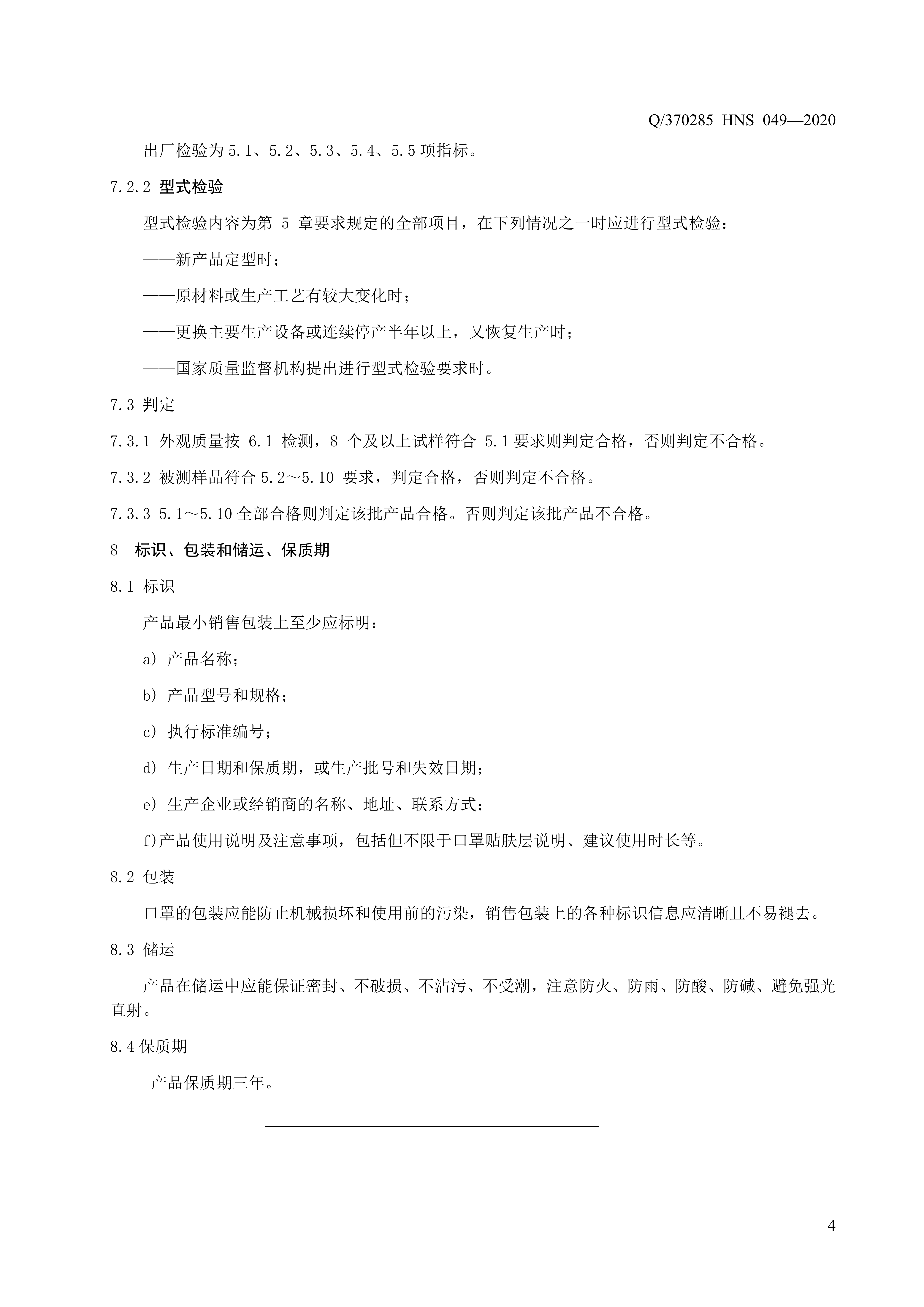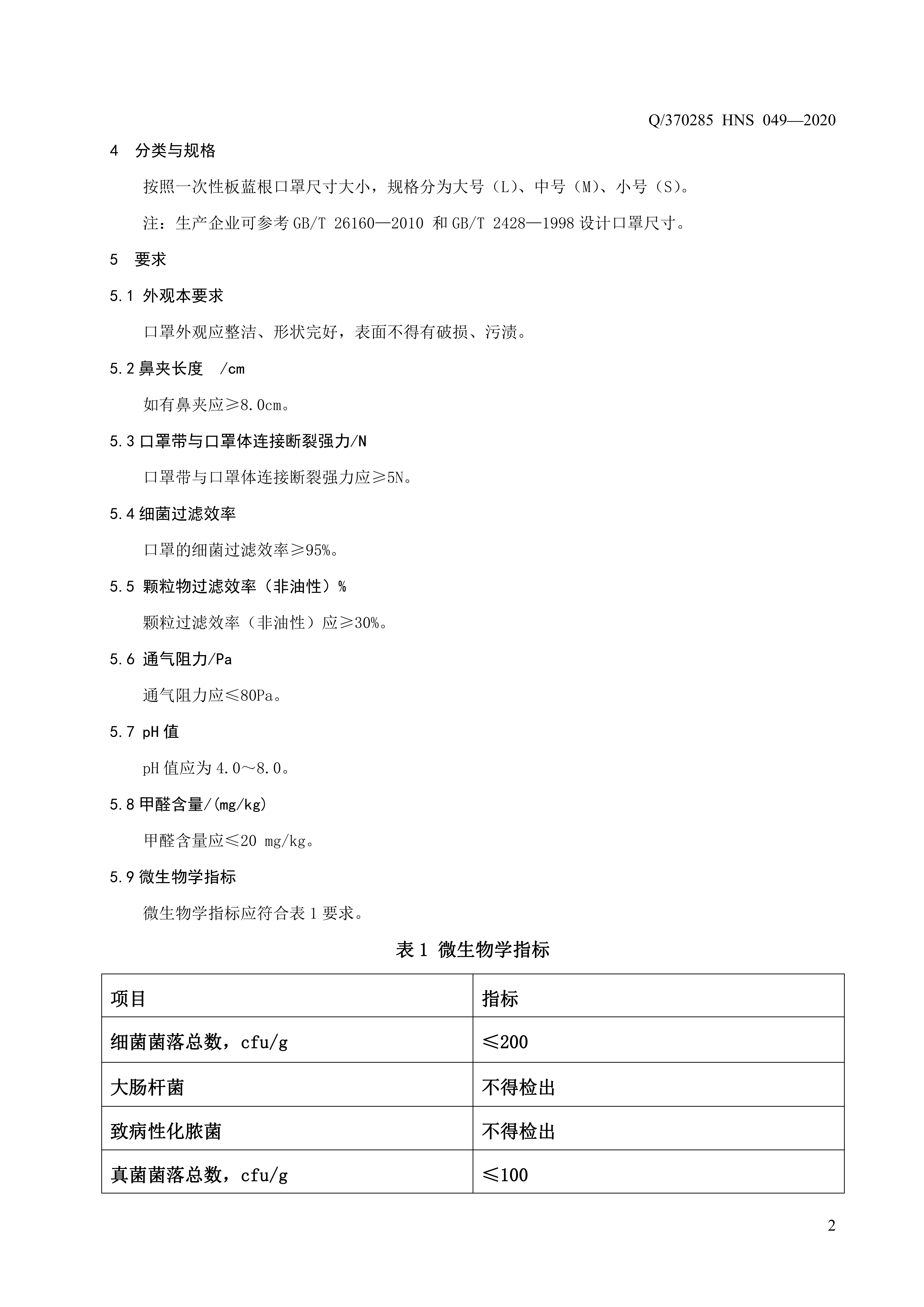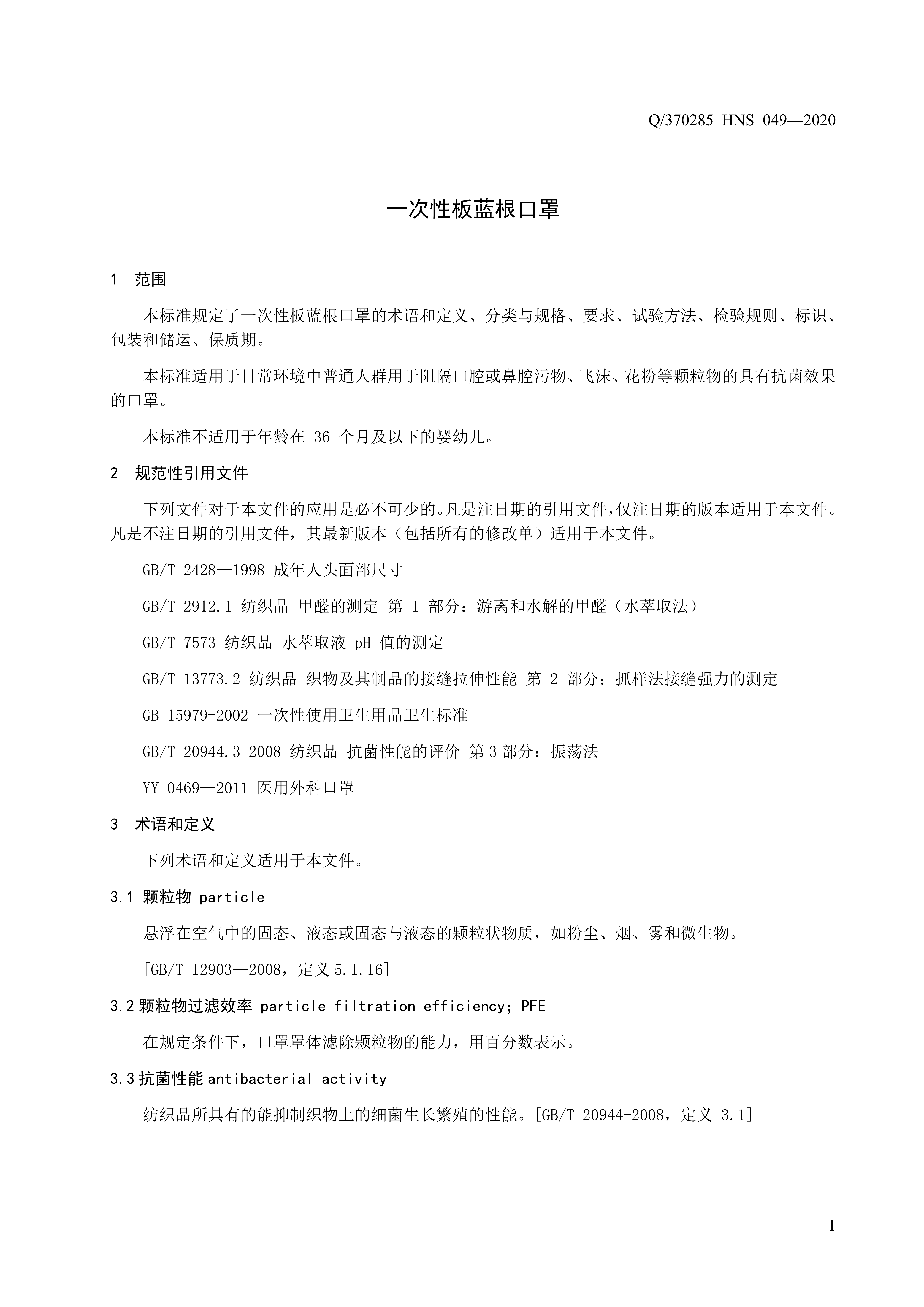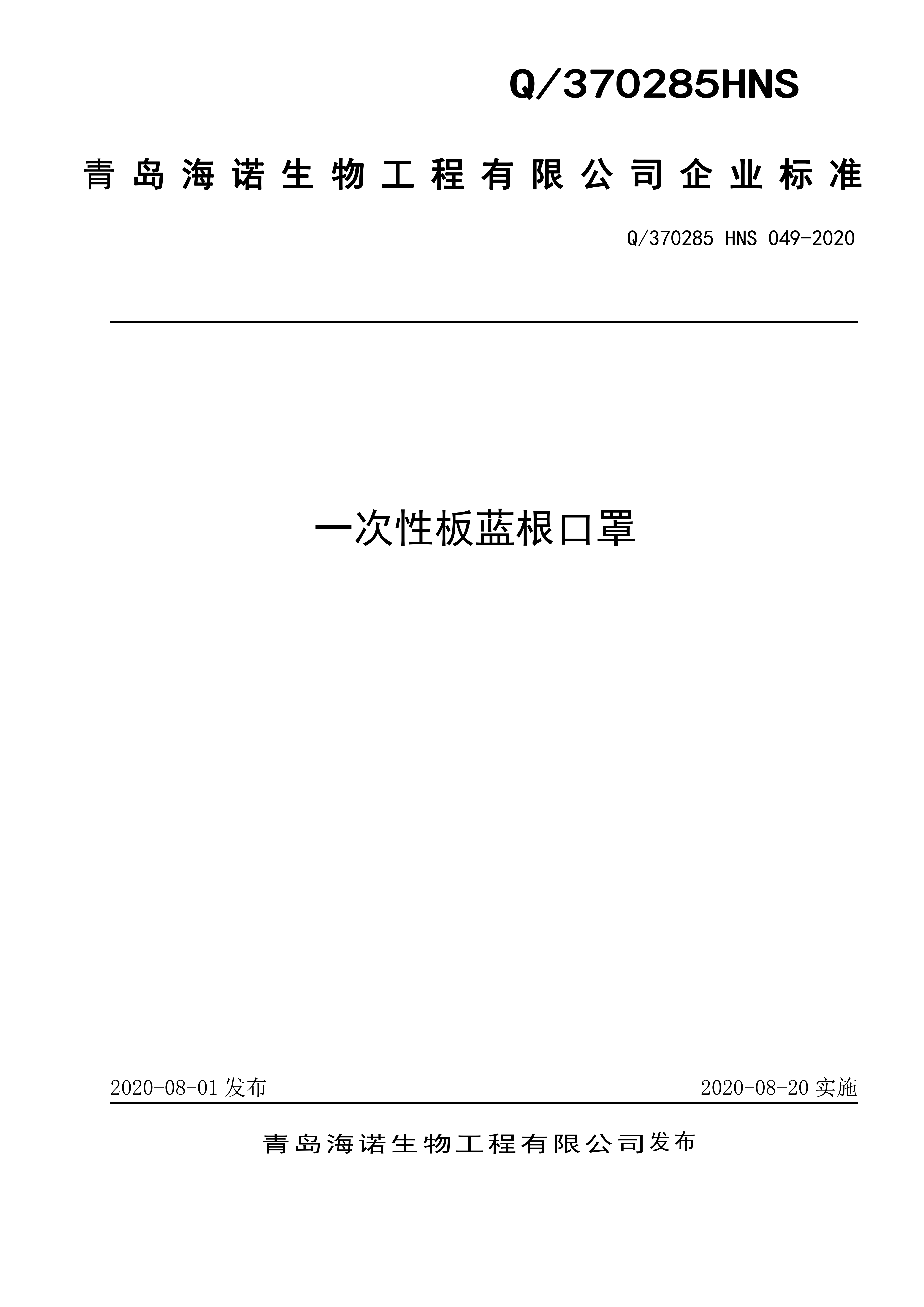 青岛海诺生物工程有限公司企业标准 — 一次性板蓝根口罩